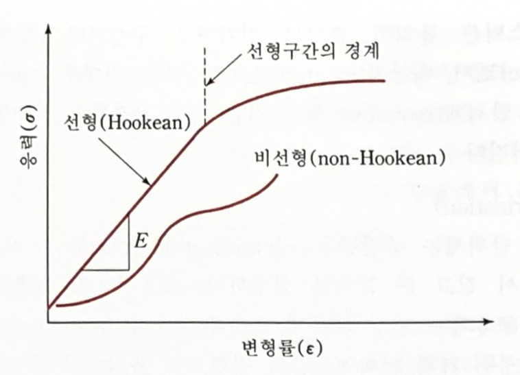 이때, F는 힘, x는 변위, 그리고 k는 스프링 상수로 표현되는 비례계수이다. 다음 그림은 선형과 비선형 변형에 따른 응력-변형률곡선을 나타내고 있다.