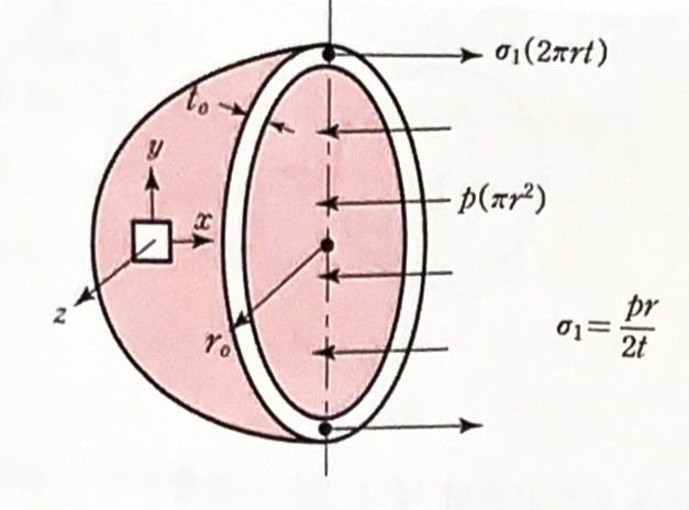 다음 그림과 같이 얇은 구각용기가 내부압력 p 를 받는다고 하자. 압력이 증가하면 구각용기의 재료도 불안정조건에 이르게 된다.