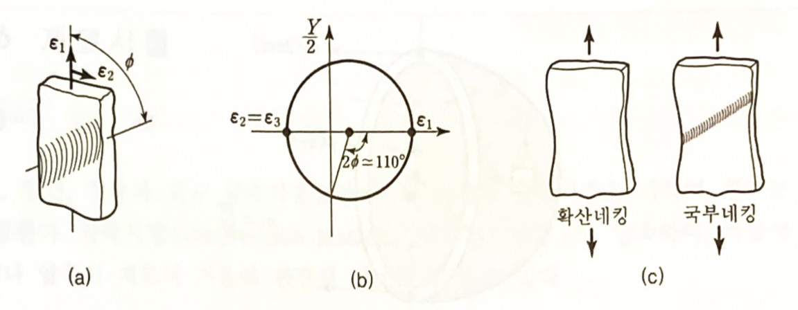 각도 φ는 모어변형률원의 ε1점으로부터 2φ만큼 회전(시계방향 또는 반시계방향)시킴으로써 정할 수 있다. 이 각도는 110° 정도로, φ는 55°에 해당한다. 판재면에서 이방성이 있는 재료의 경우에는 각도 가 다르게 계산된다. 그림 (a)에서 φ가 시계방향이나 반시계방향으로 정해질 수 있으므로 인장시편에는 이중 국부네킹이 일어날 수 있다.