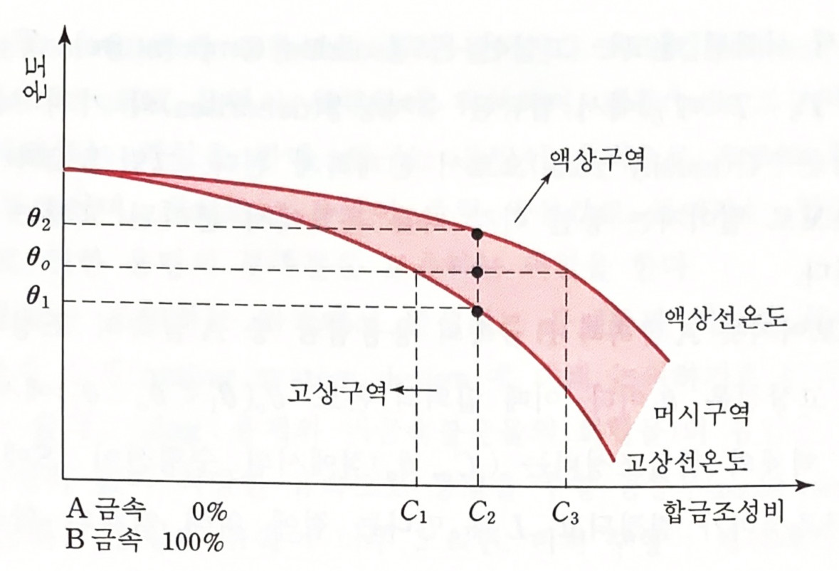순수금속과 달리 합금 (alloys)은 응고점이 어느 한 점에서 명확히 정의되어지지 않는다. 합금의 응고는 일정한 온도범위에 걸쳐서 이루어진다. 즉, 액상선 온도(liquidus temperature) TL에서 시작된 응고는 고상선 온도(solidus temperature) Ts에서 끝을 맺는다. 이 온도구간 Ts<T<TL)에서 합금은 수지상정(dendrites)의 가지 사이에 액체가 존재하는 고•액 공존구간(mushy zone)으로서 존재하게 된다. 다음 그림과 같이 액상선 온도에서 고상선 온도로 떨어지는 동안 각각 다른 온도에서 분리된 고체는 각각 다른 합금조성비를 갖게 된다.