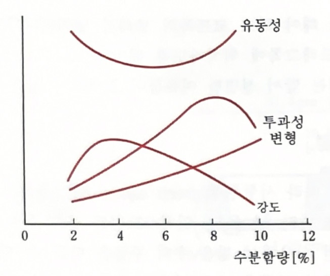 강도와 통기성을 보면 수분함량의 최적값이 존재함을 알 수 있다. 수분함량이 낮을 경우 모래입자보다 작고 건조한 진흙입자가 모래입자 사이의 틈을 채우게 되어 통기성이 낮아진다. 수분함량이 높아질수록 습한진흙이 모래입자를 덮어 입자 사이의 간격을 멀어지게 하고, 이로써 통기성은 증가하게된다. 최적수분함량치 이상에서는 부분 자체가 모래틈새를 채우게 되어 통기성이 낮아지게 된다.