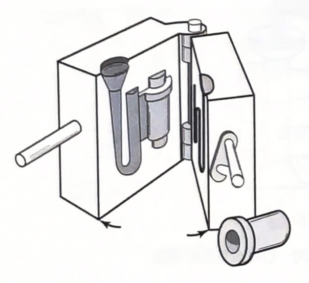 주형의 좌측 부분에는 게이트, 라이저 그리고 코어가 결합된 주물의 형상이 보인다. 영구주형의 경우에 코어 재료는 모래, 석고(plaster), 금속 등이 사용된다.