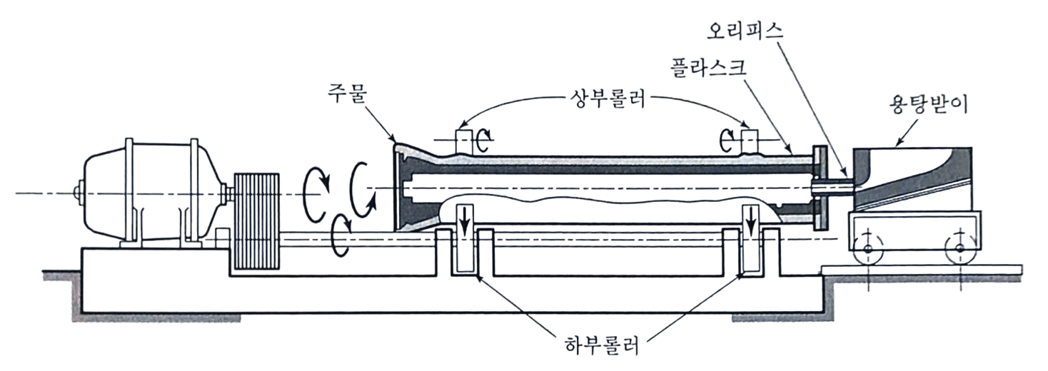 : 주물은 자신의 주축을 중심으로 회전하게 되므로 이때 발생하는 원심력이 관형태의 주물의 안지름을 자연스럽게 형성시켜 주기 때문에 라이저와 중심 코어가 필요하지 않다.