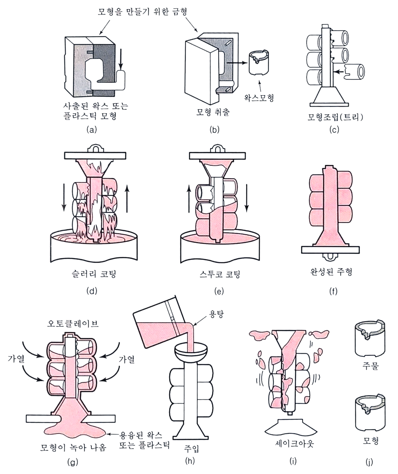 인베스트먼트 주조(investment casting)는 소실왁스(lost wax), 소실모형(lost pattern), 핫 인베스트먼트(hot investment) 그리고 정밀주조(precision casting) 등의 다양한 명칭을 갖고 있다. 이 공정에서는 왁스나 플라스틱과 같은 열에 녹는 재료로 모형을 만든다. 여러 개의 모형과 게이팅시스템을 조립하여 나무형태로 만들고, 이를 양끝이 뚫린 스테인리스 스틸 원통 속에 넣는다. 알루미나(alumina), 실리카(silica), 집섬(gypsum), 지르코늄 실리케이트(zirconium silicate) 등의 내화제가 첨가된 적당한 결합제의 슬러리를 모형 위에 붓고 진동을 가하여 공기방울을 제거한다. 내화제가 적당히 응고된 후, 원통용기를 오븐에 넣고 서서히 가열하면 내화제는 더욱 단단해지고 모형은 녹아 흘러내리거나 기화되어 주형 공동부가 형성된다. 이렇게 완성된 주형은 650~1000℃까지 가열되고, 여기에 용탕이 부어진다. 녹일 수 있는 거의 모든 종류의 합금은 적당한 내화제의 선택과 알맞은 주형온도의 조절을 통해 인베스트먼트 주조가 가능하다.