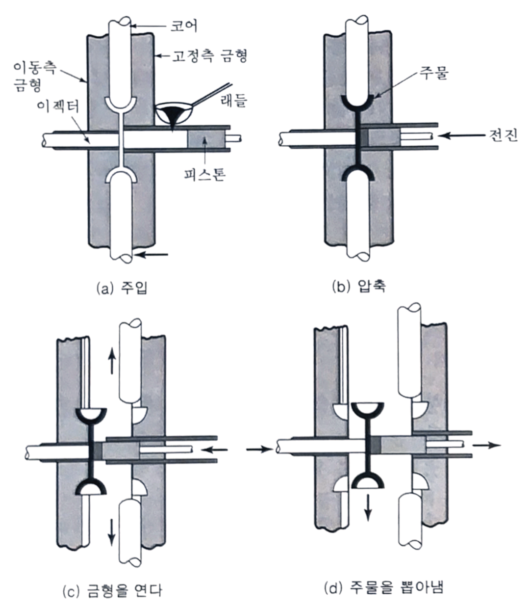다음 그림은 다이캐스팅의 저온챔버공정을 대략적으로 나타낸다. 아연, 알루미늄, 구리, 마그네슘, 납, 주석 등의 합금으로 된 용융금속이 이들로부터 가압챔버에 부어진다(그림(a)). 이때 챔버는 가열되지 않은 상태이다. 다음에 플런저의 전진운동으로 용탕은 20000 psi 또는 그 이상의 압력으로 주형에 주입된다(그림(b)). 주물이 응고된 후, 금형이 열리고 코어가 빠진다(그림(c)). 마지막으로 이젝터 핀(ejector pin)이 주물을 주형으로부터 방출시킨다(그림(d)).