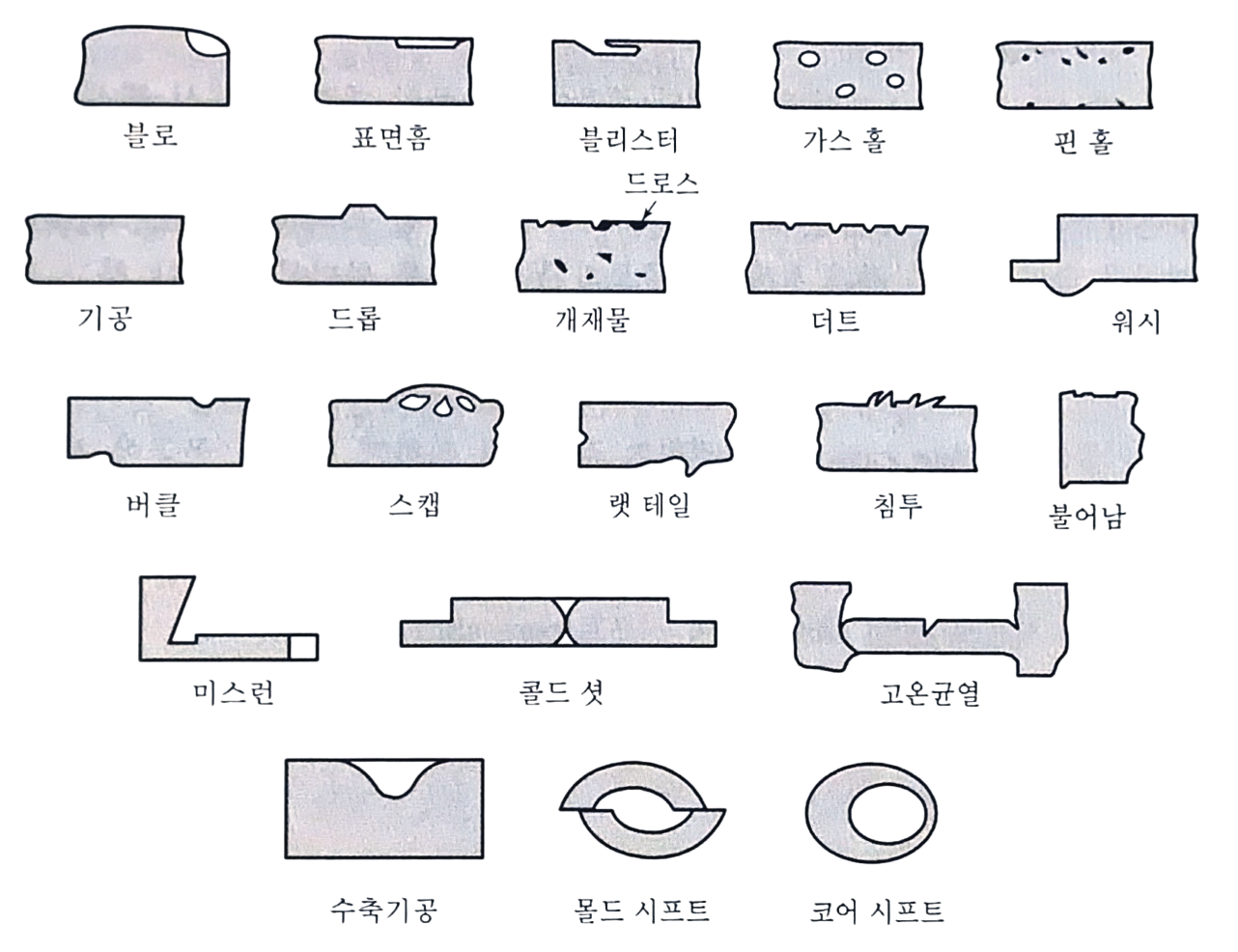 9) 드로스(dross) : 주물 윗면에서 발견되는 조그마한 불순물을 드로스라 한다. 주입단계에서 여과기나 그물국자를 이용하여 제거할 수 있다.