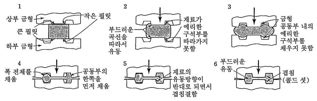 금형 공동부의 반지름은 결함 생성에 중요한 영향을 미칩니다. 다음 그림에서 코너 반지름이 클 때는 재료가 잘 유동하지만, 반지름이 작으면 재료가 겹쳐져 콜드 셧(cold shut)이라는 겹침 결함이 생깁니다.
