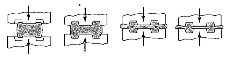 원주형 시편을 압축하여 배가 나온 표면에 균열이 생기는지를 관찰합니다. 균열이 발생할 때까지의 높이 감소율이 클수록 그 금속의 단조성이 양호합니다. 이때 생기는 균열은 배가 나온 표면에 생기는 2차 인장응력 때문입니다. 마찰이 클수록 균열이 발생할 가능성이 높아집니다.